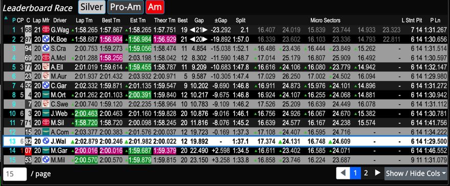 - Hero (#82), sister cars and class leaders can be immediately located by